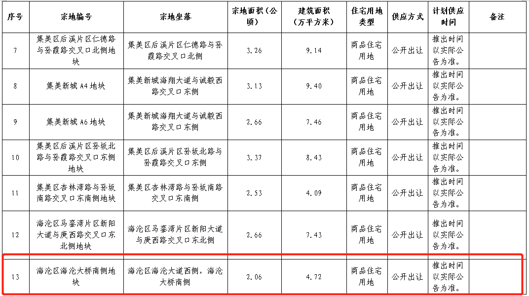 根据2023年厦门供地计划,这幅地块位于海沧大道西侧,海沧大桥南侧,具体位置在海晟维多利亚小区右侧(称哈啰小镇地块),土地面积2.06公顷,建筑面积4.72万㎡。