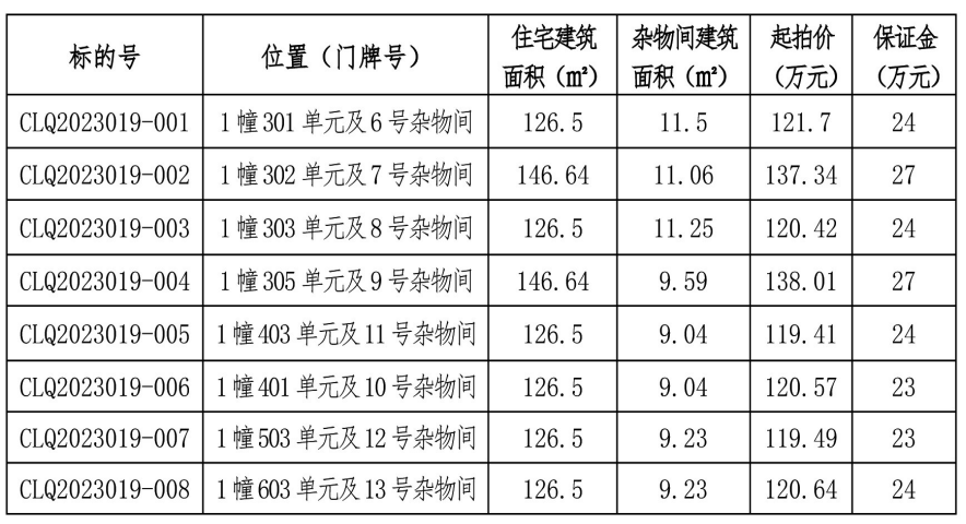2.以上标的面积仅供意向竞买人参考,具体以意向竞买人实地勘察及产权证面积为准;8套房产须与杂物间配套拍卖,逐套以增价的拍卖方式进行现场竞价,价高者得。