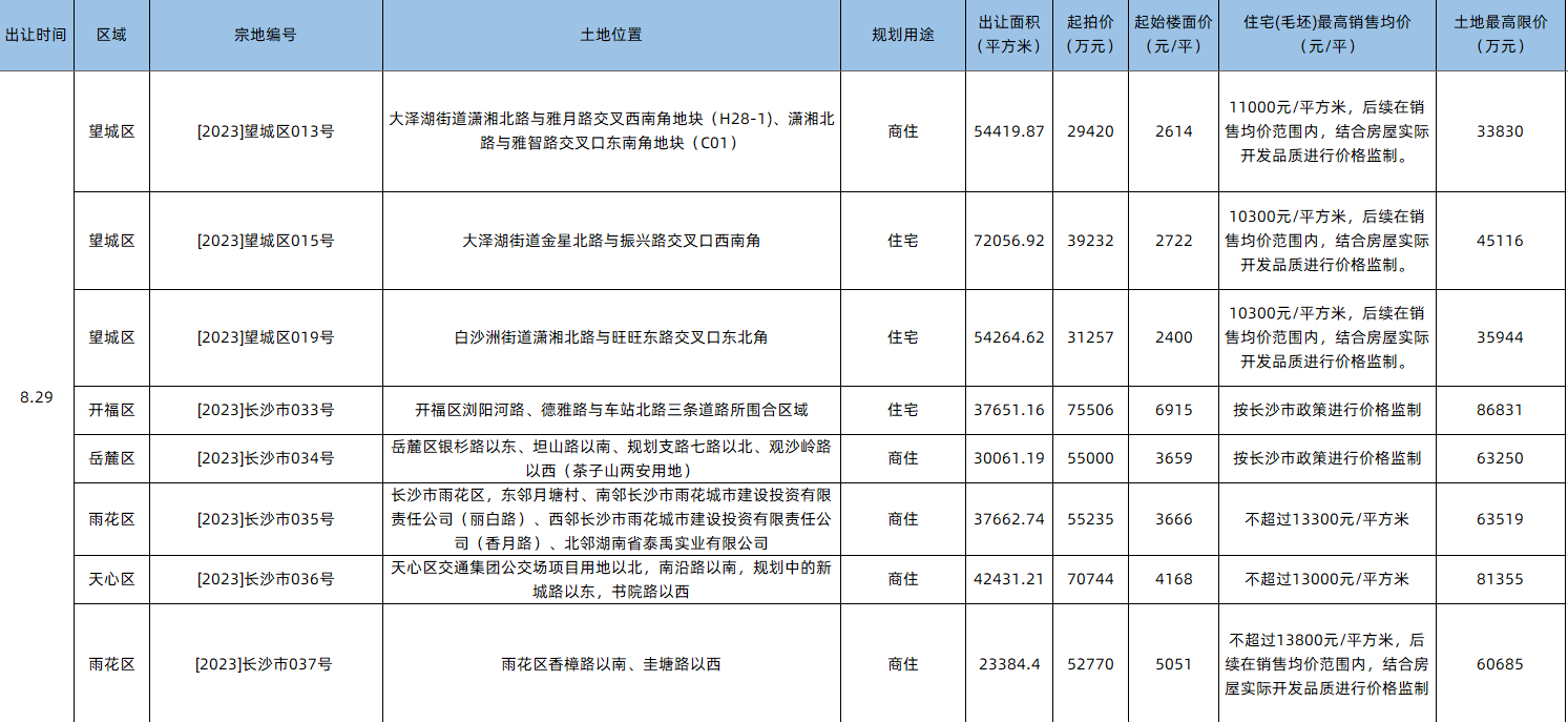 7月28日,长沙市国土资源交易网站公示了8宗地块的宗地挂牌信息,其中望城区3宗,开福区、岳麓区、天心区各1宗,雨花区2宗,将于2023年08月17日09时00分正式挂牌,2023年08月29日09时00分挂牌截止。土地总建面约107.1万方,总起拍价40.9亿元。均为限房价竞地价地块。以下为宗地详情:
