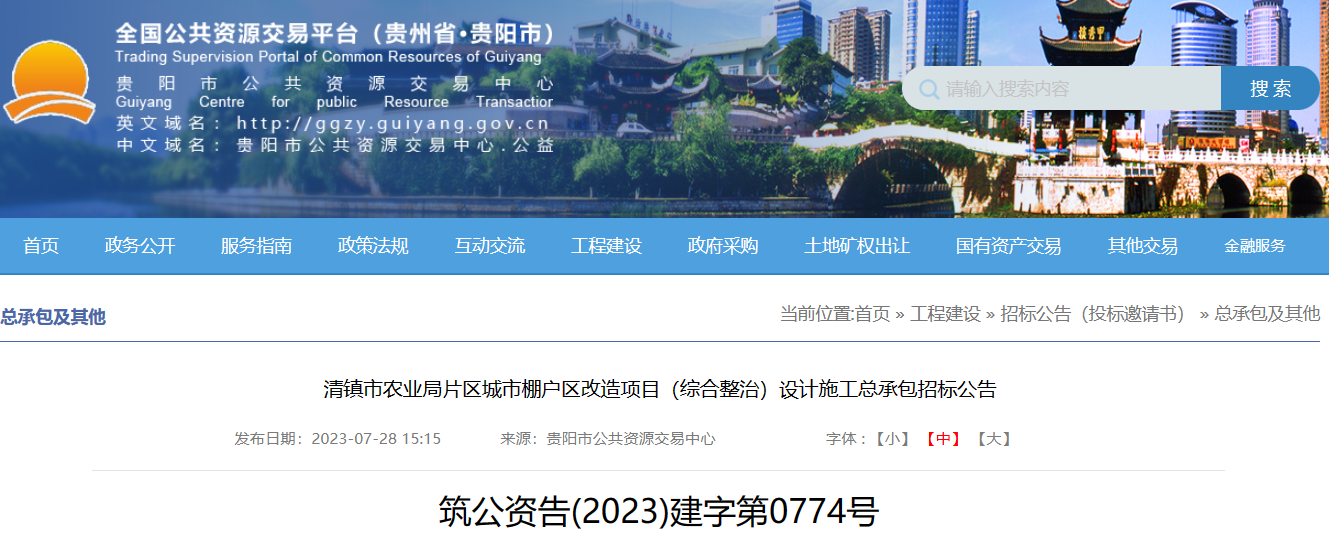 乐居新媒体 贵阳 7月28日,贵阳市公共资源交易中心发布清镇市农业局片区城市棚户区改造项目(综合整治)设计施工总承包招标公告。