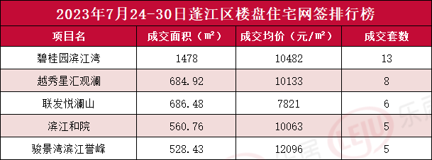 排名第三的是位于蓬江的碧桂园滨江湾,网签13套,网签面积1478㎡,网签均价10482元/㎡。