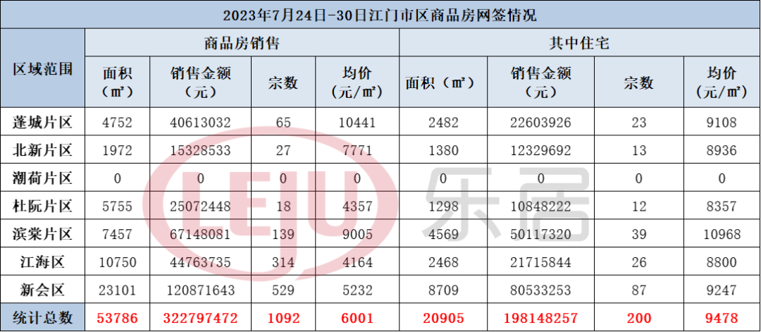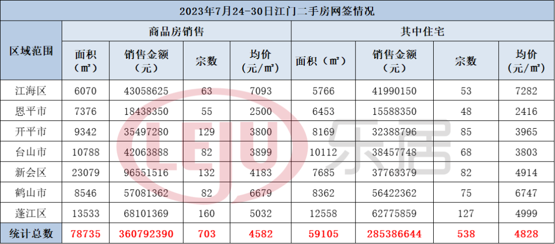 其中住宅网上签约538套(江海区成交53套、恩平市成交48套、开平市成交85套、台山市成交68套、新会区成交82套、鹤山市成交75套、蓬江区成交127套),签约面积为59105㎡,销售金额为285386644元,均价为4828元/㎡。