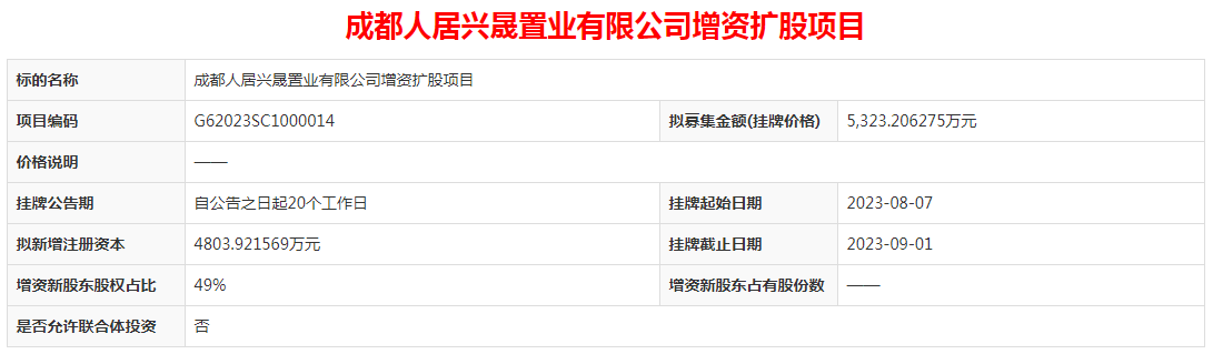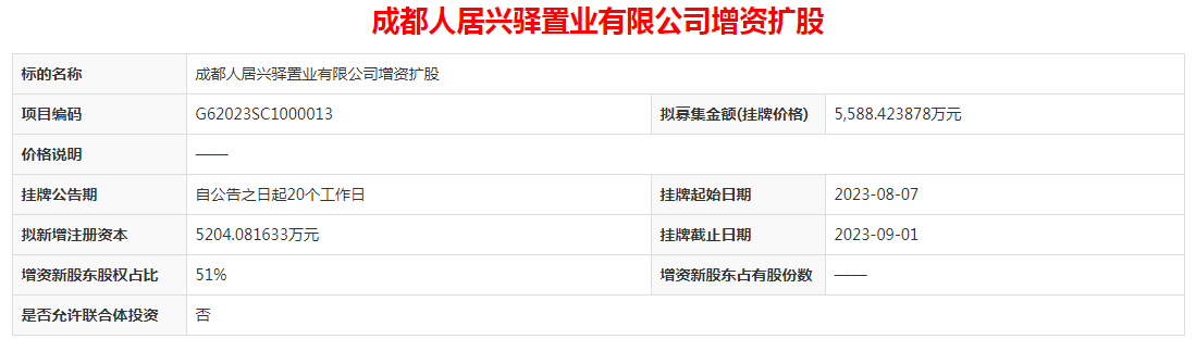 据西南联合产权交易所,“成都人居兴驿置业有限公司增资扩股”,“成都人居兴晟置业有限公司增资扩股”正式挂牌。