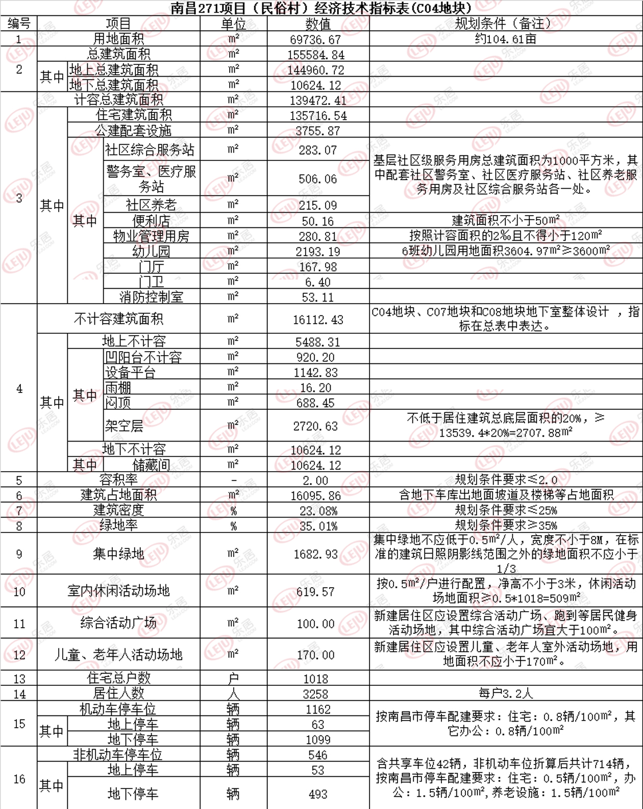 C04地块总用地面积69736.67平(约104.61亩),总建筑面积155584.84平(约15.5万方),住宅建筑面积135716.54平(约13.5万方),容积率2.0,绿化率35.01%,住宅总户数1018户,机动车位1162个(地上63个、地下1099个),车位配比约1:1.14。