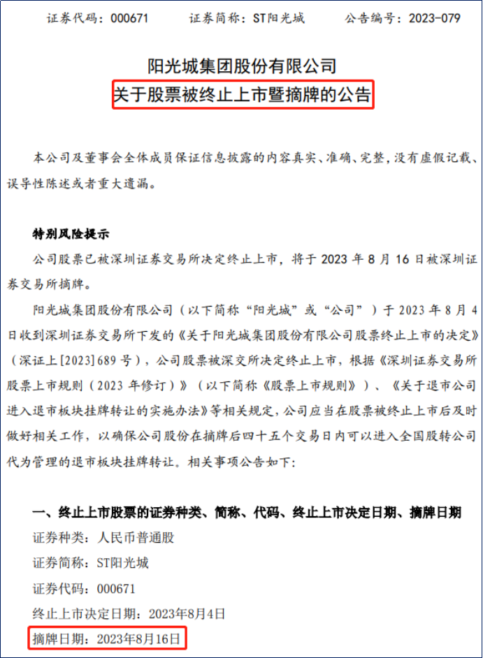 继8月4日,泰禾集团摘牌后,阳光城也未能幸免于难。8月14日晚间,阳光城发布公告,公司股票将于2023年8月16日被深圳证券交易所摘牌。