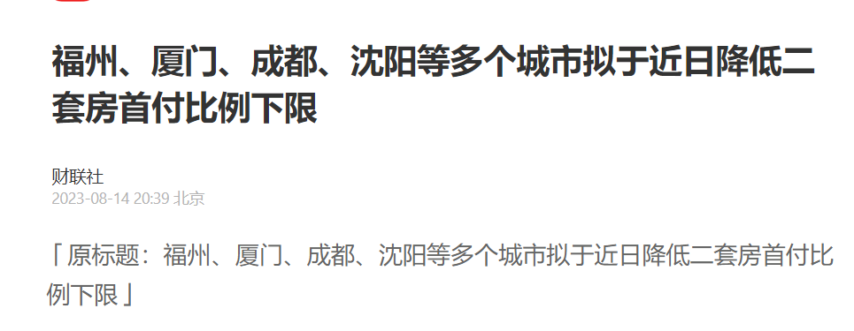 昨日深夜,财联社发文称:从多个信源了解到,福州、厦门、成都、沈阳等多个城市拟于近日调整优化限购政策,降低二套房首付比例下限。限购取消后,当地首套、二套房最低首付比例可进一步降至20%、30%。