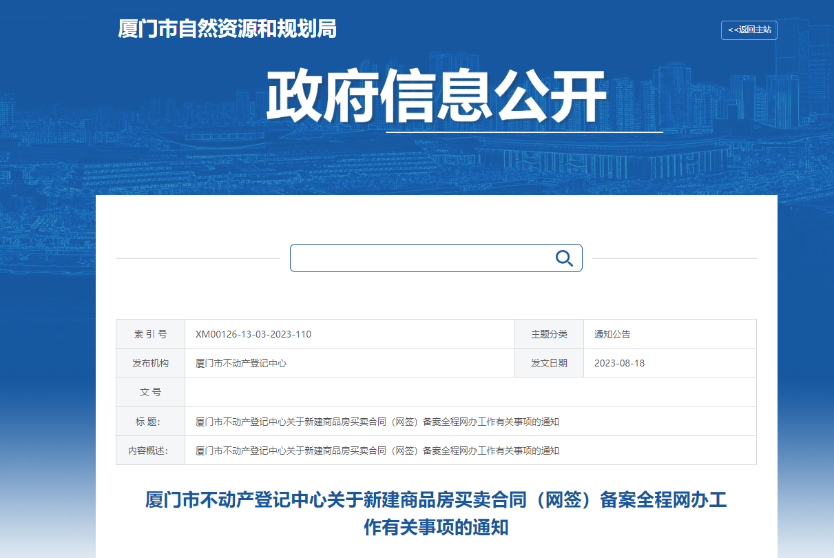 乐居买房 厦门市不动产登记中心发布关于新建商品房买卖合同(网签)备案全程网办工作有关事项的通知。