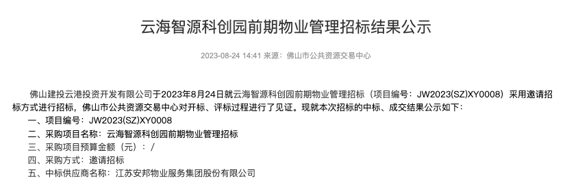 8月24日,乐居编辑获悉,江苏安邦物业服务集团股份有限公司正式中标云海智源科创园的前期物业服务公司。