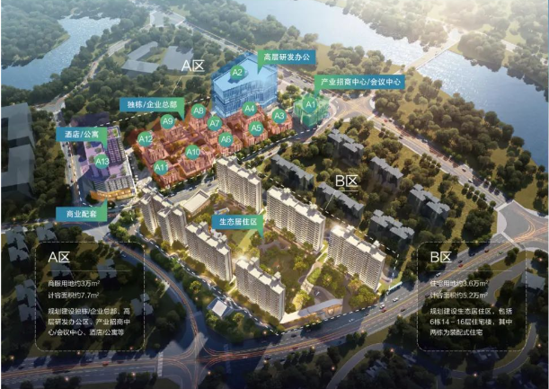 整个项目将分为两区开发。其中,A区计容7.7万㎡,主要规划建设1栋12层的研发办公楼,1栋8-14层的公寓楼,10栋3-4层的独栋/企业总部。