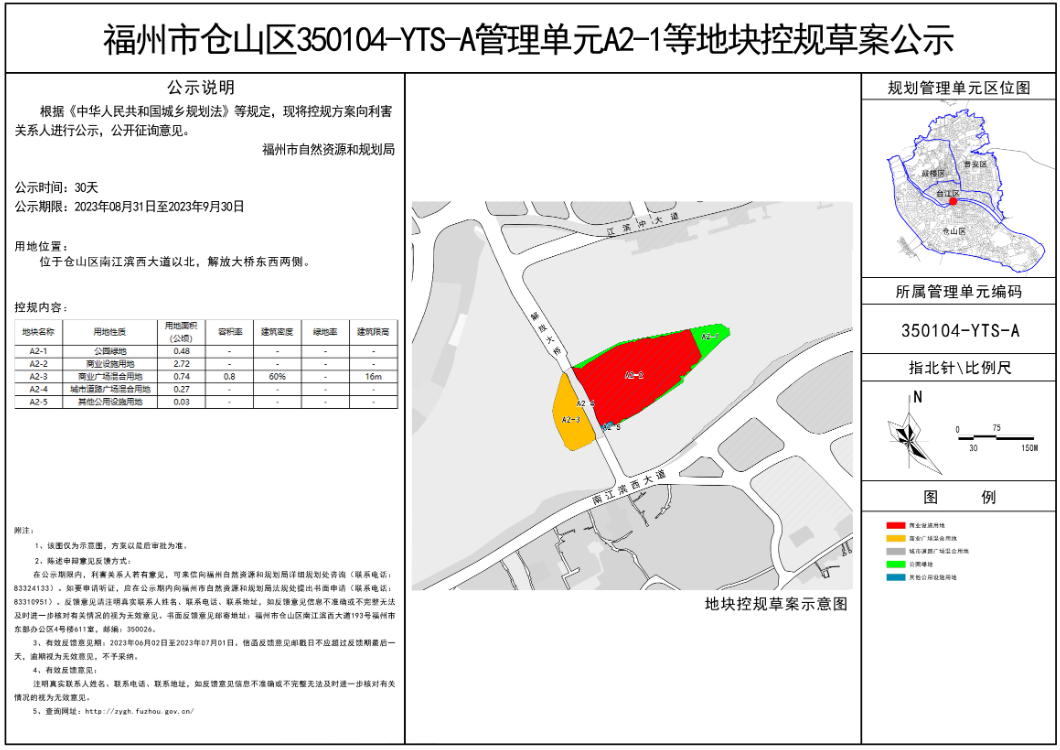 8月31日,福州市自然资源和规划局发布《福州市仓山区350104-YTS-A管理单元A2-1等地块控规草案公示》。