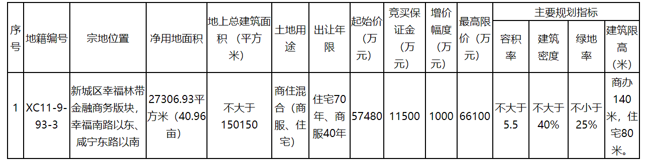 地籍编号XC11-9-93-3,地块位于新城区幸福林带金融商务版块,幸福南路以东、咸宁东路以南,净用地面积27306.93平方米(40.96亩)。