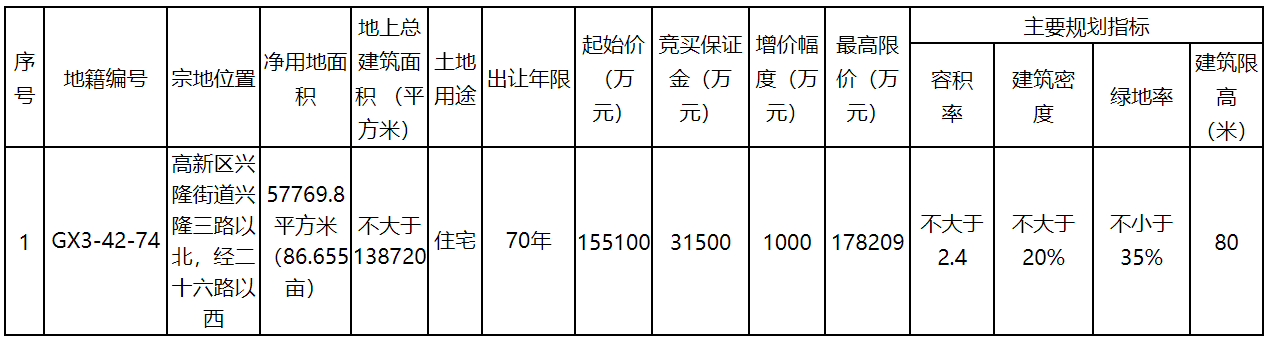 GX3-42-74地块位于高新区兴隆街道兴隆三路以北,经二十六路以西,净用地面积57769.8平方米(86.655亩)。