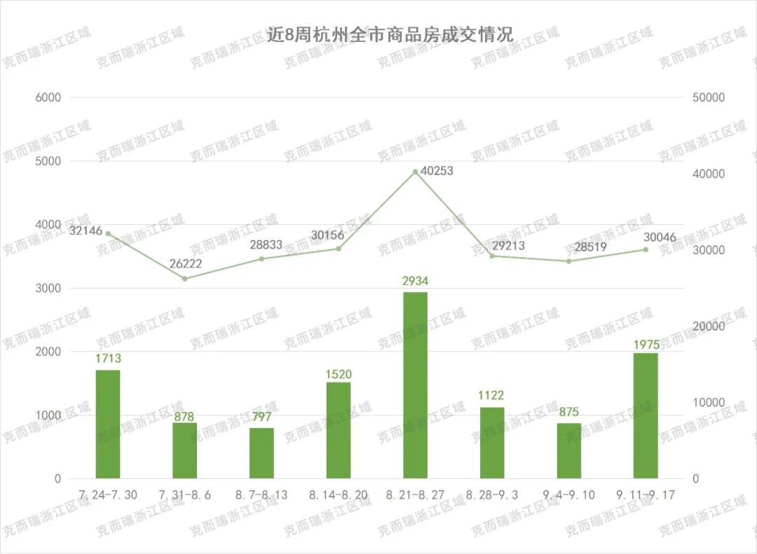 数据显示,上周(9.11-9.17)杭州新房市场量价齐升。全市共成交商品房1975套,较前一周翻番,涨幅125.7%;成交均价为30046元/平米,环比上涨5.4%。