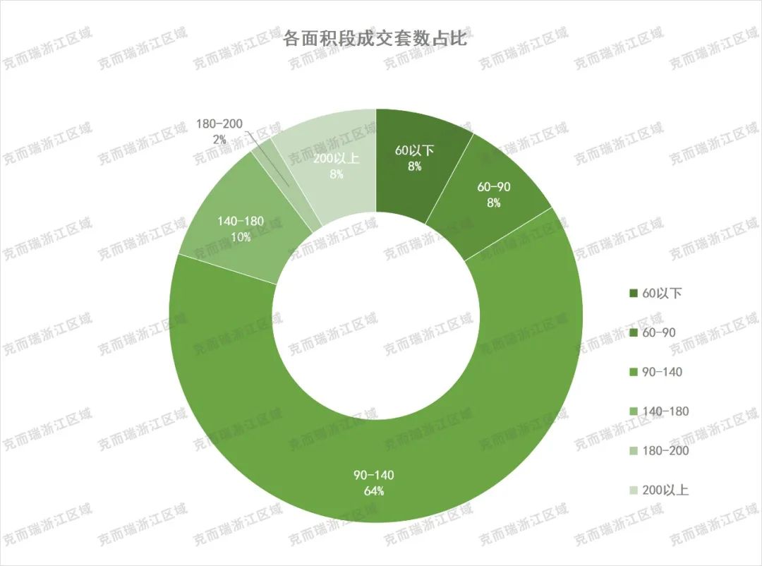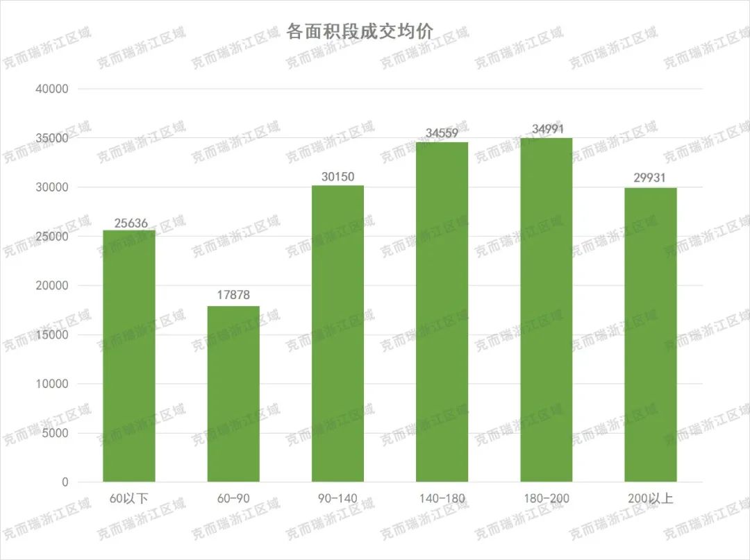 从各面积段房源的成交及价格表现上来看,90-140平米的房源仍为成交主力,占比64%;180-200平米的房源成交均价较高,为34991元/平米。