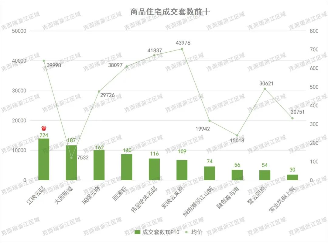 上周的商品住宅成交排行榜中,成交前三分别为滨江区的江映云邸(同备案名,成交224套,均价39998元/平米)、临安区的大园新城(同备案名,成交187套,均价7532元/平米)、萧山区的华润华发珹曜云府(备案名:珹曜云府,成交162套,均价29726元/平米)。