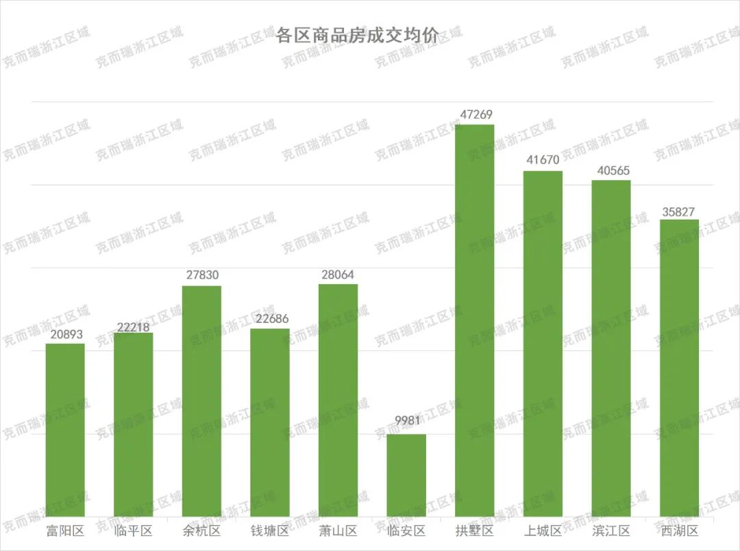 从各区的成交均价来看,拱墅区以47269元/平米的成交均价名列前茅,其次是上城区,成交均价41760元/平米,再次是滨江区,成交均价40565元/平米。