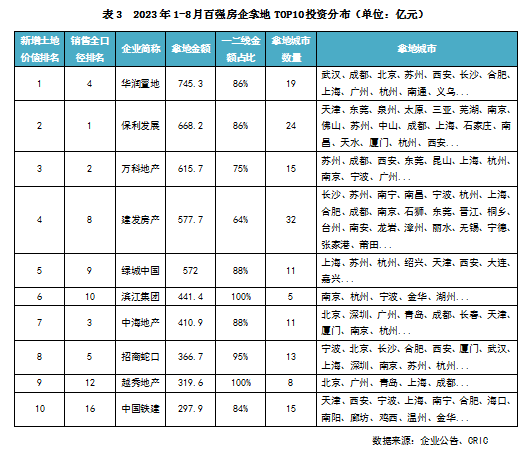 通过1-8月投资金额TOP10房企的投资分布来看,仍积极拿地的房企对于核心城市的偏好表现更为凸显:华润、招商、中海、越秀等企业拿地高度集中于一二线核心城市,在一二线城市的投资金额占前8月总投资额的90%。