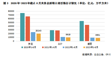 2023年前三季度投资持续低迷,且较上半年相比未有明显改善。1-8月新增货值、总价和建面百强的总额分别为20243亿元、9619亿元和8551万平方米,其中拿地金额同比下降13%,与6月末相比,同比降幅进一步扩大4个百分点。