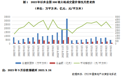 1)成交规模维持年内高位,上年基数增加致同比降幅扩大。2023年三季度,虽然进入预供地清单截止期的土地有所增多,但在大批优质地块于上半年出让之后,三季度土地平均质量有所下降,再加之二季度以来新房市场交易信心的回落,导致土地成交并未出现大幅环比上升,再加之2022年同期基数的增加,导致全国土地成交同比降幅较二季度进一步扩大。截止9月24日,第三季度经营性土地成交建面为2亿平方米,较二季度同期环比增加一成左右,同比下降29%,成交金额7207亿元,环比持平,同比下降31%,同比降幅分别较二季度扩大了3和9个百分点。价格方面,因平均土地成交质量有所下降,再加之三四线成交占比上升,成交均价为3519元平方米,较二季度下滑了11%。