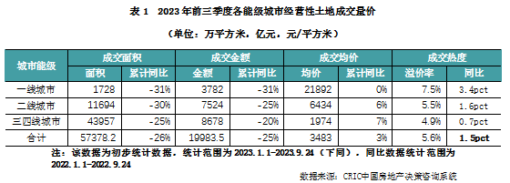 2)二三线溢价率同比涨幅收窄,仅一线城市溢价率相对稳定。2023年三季度以来,受销售端波动和资金面压力影响,企业经营策略持续趋于保守。在此背景之下,虽然北京、上海等一线城市平均溢价率仍处在高位,但大多数城市土拍热度均有所回落。前三季度整体溢价率下探至5.6%,较上半年下降了0.9个百分点,同比增幅收窄至1.5个百分点。