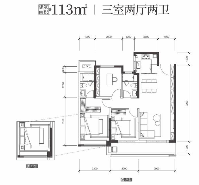 约113㎡户型,是中建悦庐的入门槛户型,总价270万起,该户型三室两厅两卫设计,三开间朝南,打通实现约6.9米巨幕宽厅,极目视野;餐客一体,南北通透;主卧套房设计,私密性强;U型厨房,备餐便捷;独立明卫,通风好。