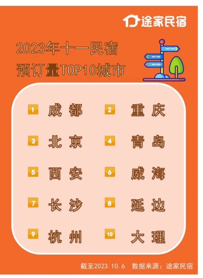 途家民宿数据显示,截至10月6日,今年“十一”期间国内热门城市民宿预订量同比2019年增长1.5倍,每晚平均支付价格达503元。民宿预订热门目的地第一位是成都,前十名分别为成都、重庆、北京、青岛、西安、威海、长沙、延边、杭州和大理。