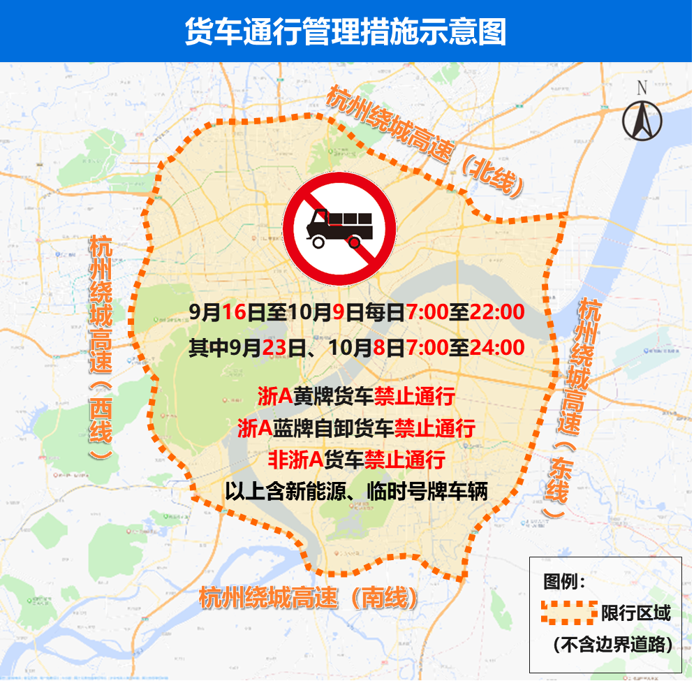 2023年9月16日至10月9日,每日7:00至22:00(其中9月23日和10月8日亚运会开、闭幕式当天延长至24:00),在G2504杭州绕城高速公路(不含)以内区域所有道路,实施以下管理措施:禁止浙A号牌重型、中型载货汽车及轻型、微型自卸载货汽车通行;禁止非浙A号牌载货汽车通行。上述车辆包含新能源号牌、临时号牌车辆。