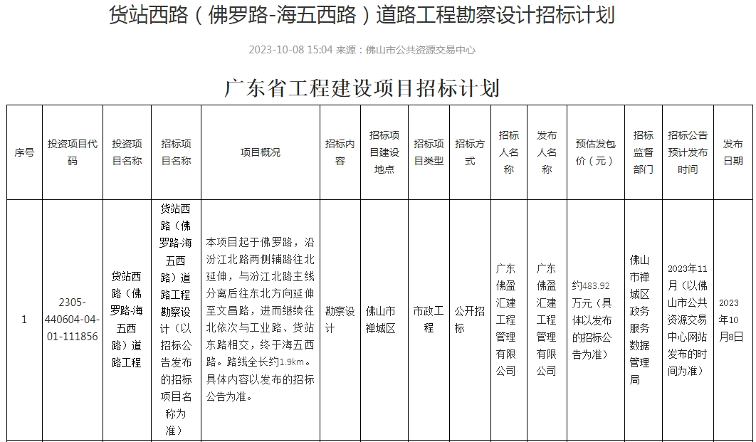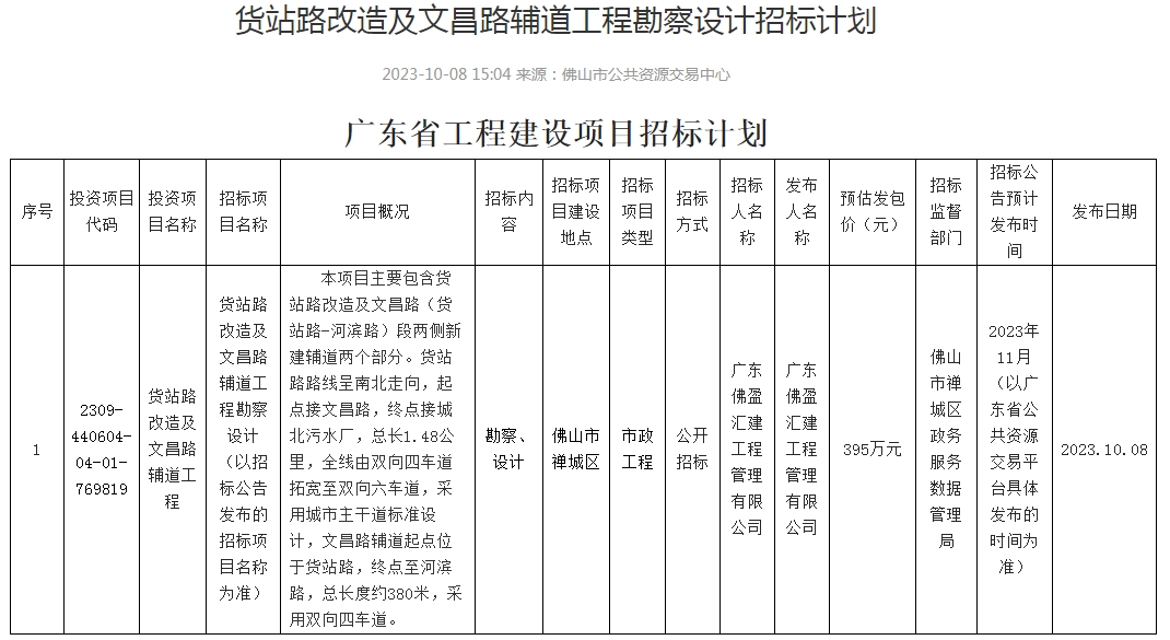 乐居从佛山市公共资源交易中心中获悉,官方公布了一份《货站西路(佛罗路-海五西路)道路工程勘察设计招标计划》和《货站路改造及文昌路辅道工程勘察设计招标计划》,并指出招标公告预计11月发布。