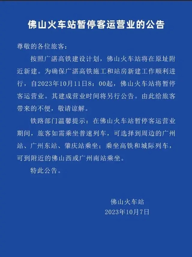 日前,佛山火车站发布了《佛山火车站暂停客运营业的公告》,正式官宣:自10月11日8时起,佛山火车站将暂停客运营业。