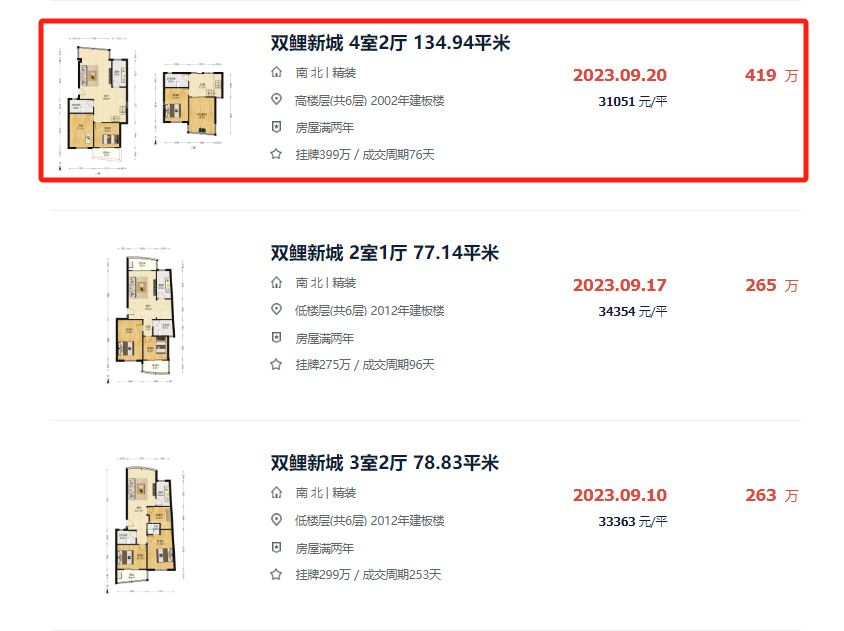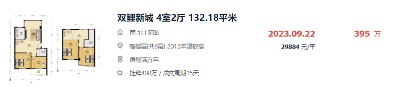 近日,双鲤新城一套132.18㎡房源,户型4室2厅,位于高楼层,成交总价395万,折算成交单价29884元/㎡,仅15天就成交。