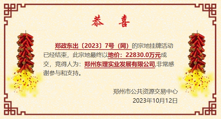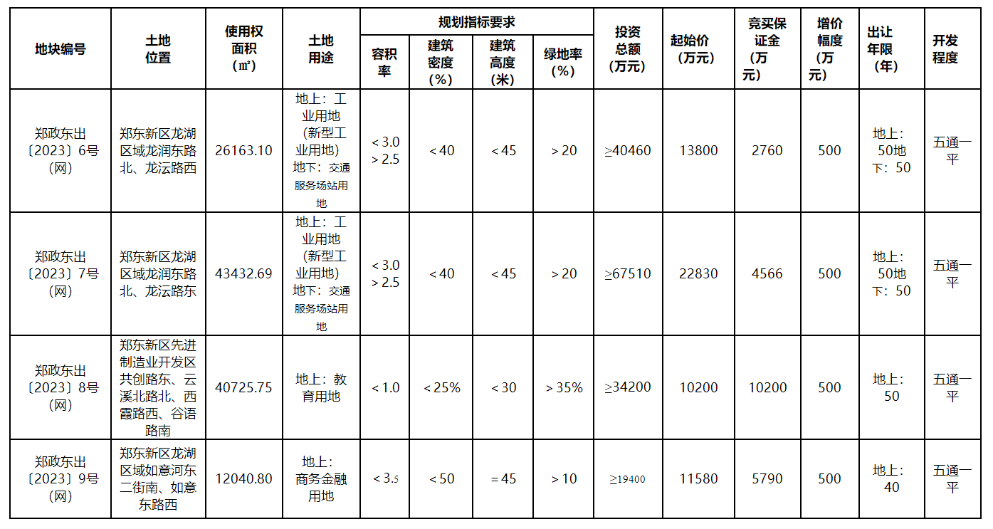 10月12日,郑州市自然资源和规划局郑东新区分局出让郑东新区郑政东出〔2023〕6、7、8、9号(网)地块的国有建设用地使用权。