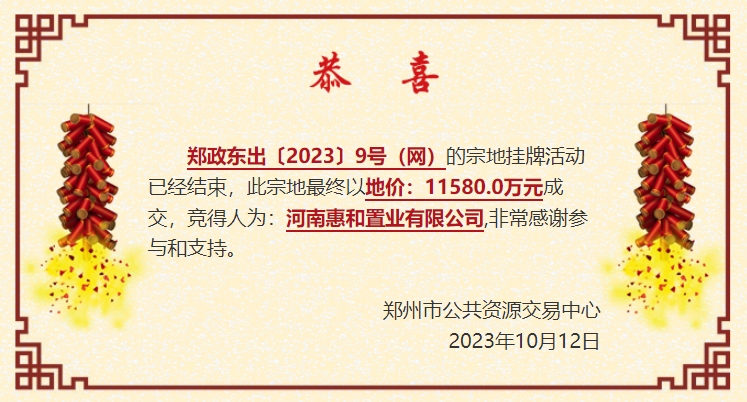 郑政东出〔2023〕9号(网)位于郑东新区龙湖区域如意河东二街南、如意东路西,使用面积12040.8㎡(约18.061亩),40年商务金融用地,容积率<3.5,河南惠和置业有限公司以起始价11580万元摘得。