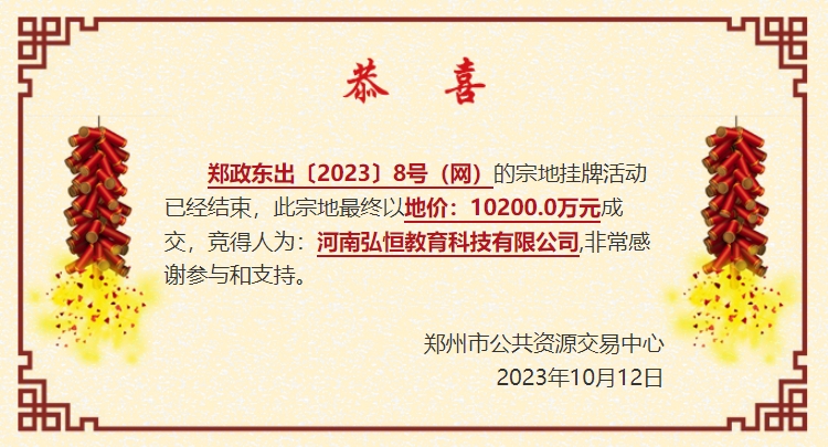 郑政东出〔2023〕8号地位于郑东新区先进制造业开发区共创路东、云溪北路北、西霞路西、谷语路南,使用面积40725.75㎡(约合61亩),50年教育用地,河南弘恒教育科技有限公司以起始价10200万元摘得。