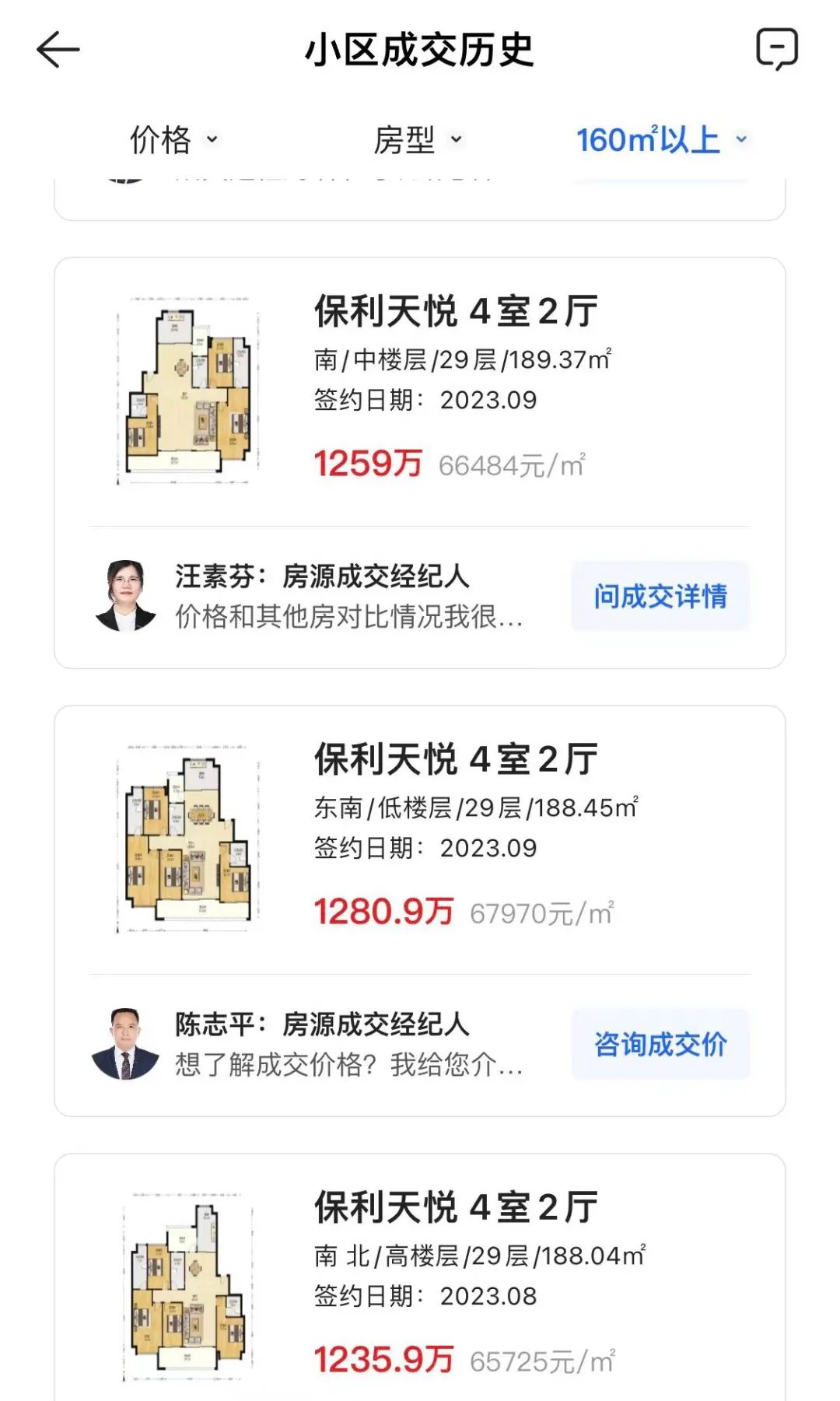 从贝壳成交数据可知,保利天悦已成交了57套,8、9月共成交7套,价格较为稳定,大户型单价维持在6.5-7万/㎡。