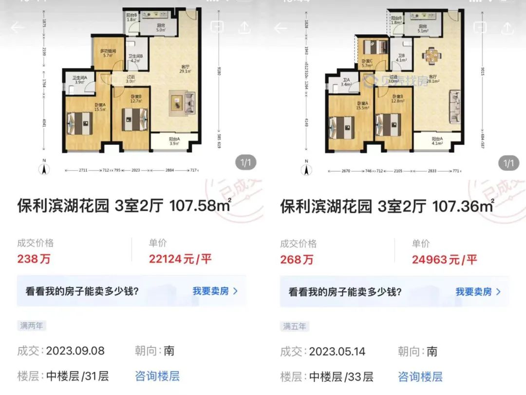 无独有偶,保利诺丁山,同样的户型,同样中楼层,南向,5月成交价是268万,9月成交价是238万,相比也是降了30万。