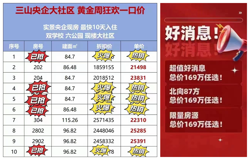三山多个楼盘的小户型均打起了特价促销,单价均在2万上下。