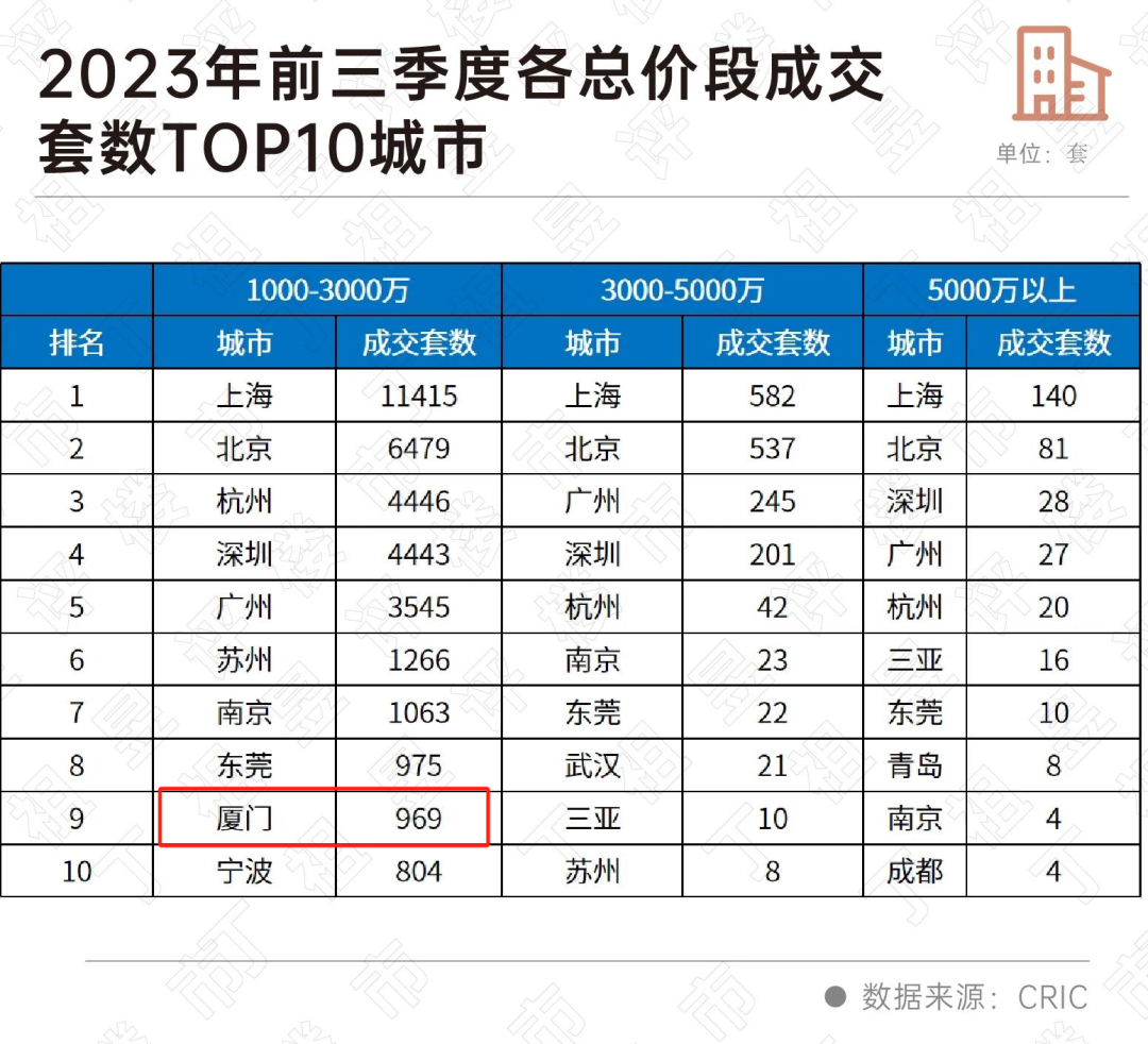 厦门则位居第九,前三季度总价1000-3000万豪宅成交969套,总价1000万以上豪宅成交同比增长了1倍多。