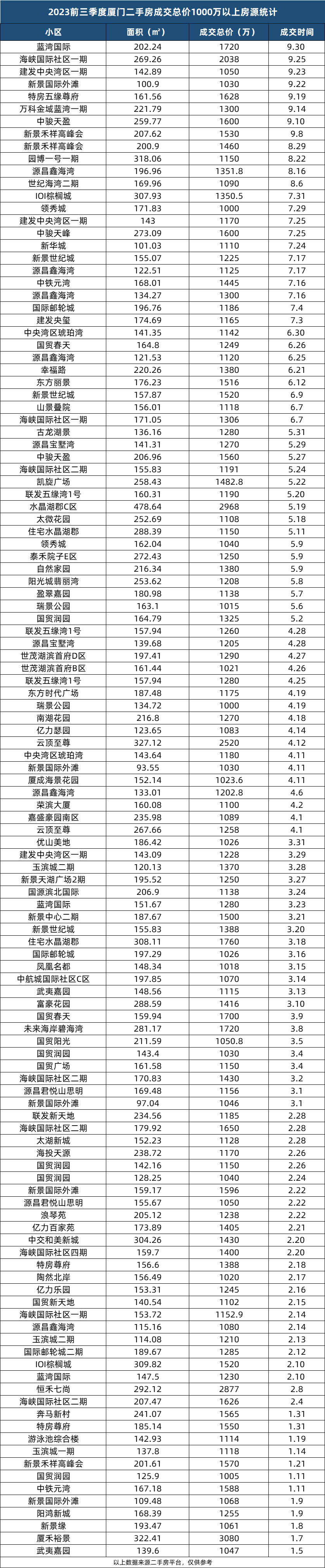 其中,成交价3000万以上仅一套厦禾裕景,2000万以上有4套,成交价在1000-1500万/套区间的居多,面积段大致都在130-180㎡。