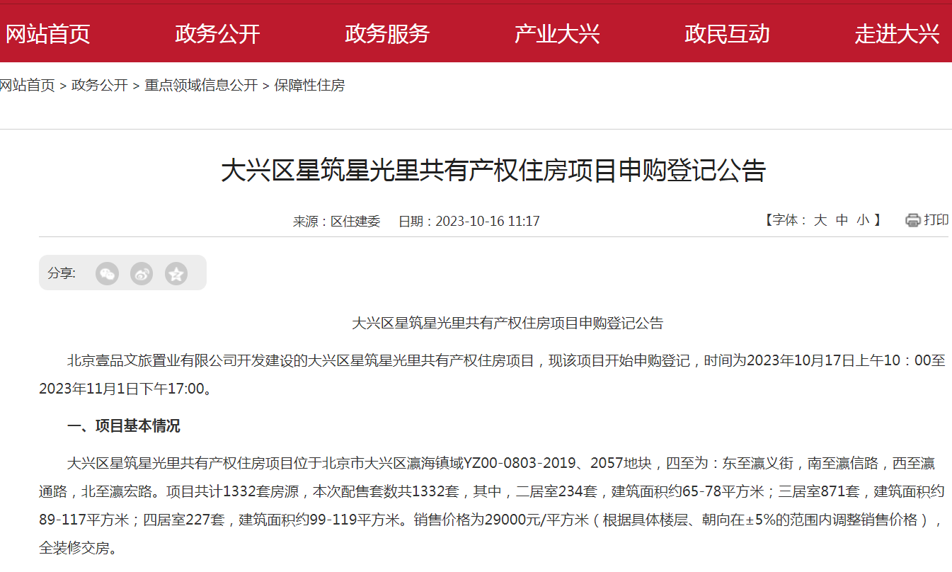 据大兴区政府官网信息,中建壹品、湖北文旅联合开发建设的共有产权住房项目星光里|星筑已经开始申购登记,时间为2023年10月17日上午10:00至2023年11月1日下午17:00。