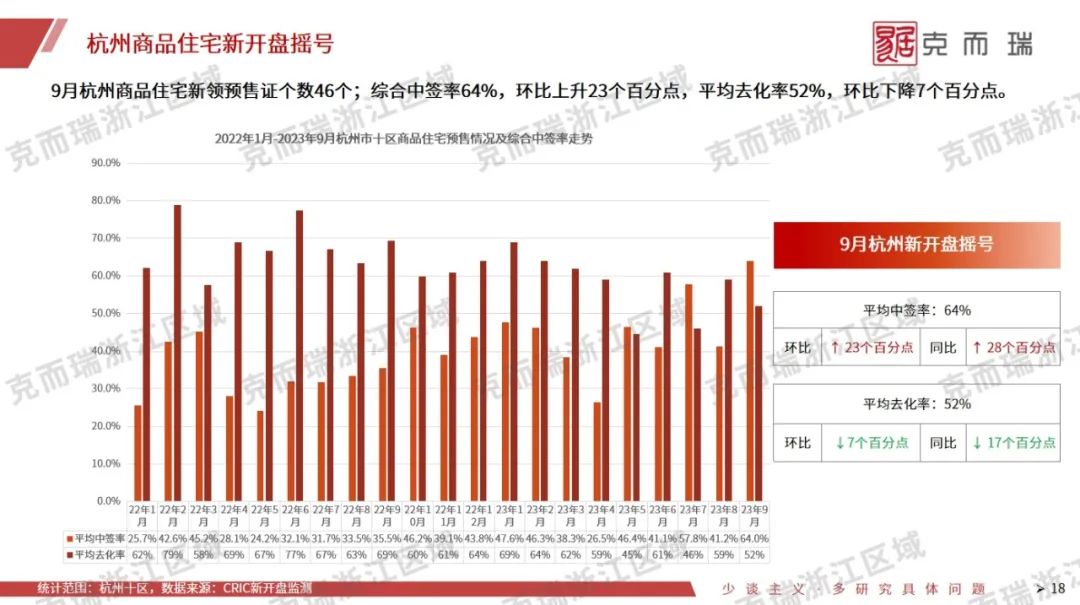 9月杭州商品住宅量价齐跌。杭十区商品住宅成交面积72.4万㎡,环比下跌2%;成交均价31976元/㎡,环比下跌12%。从新开盘监测来看,9月杭州商品住宅综合中签率64.3%,环比上升23个百分点,平均去化率52%,环比下降7个百分点。