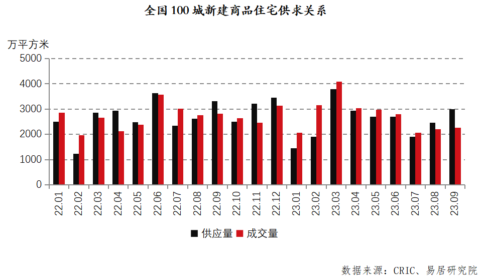 报告显示,9月份全国100个城市新建商品住宅呈现供大于求态势。其中,供应面积为2990万平方米,环比增速为22%,同比增速为-10%。成交面积为2262万平方米,环比增速为3%,同比增速为-20%。