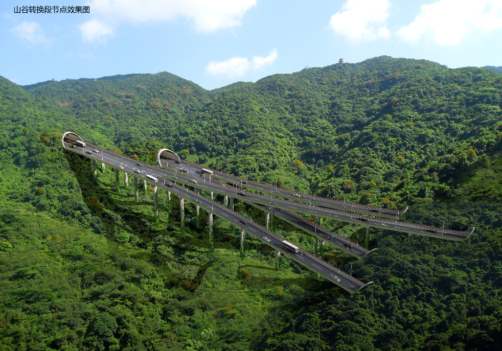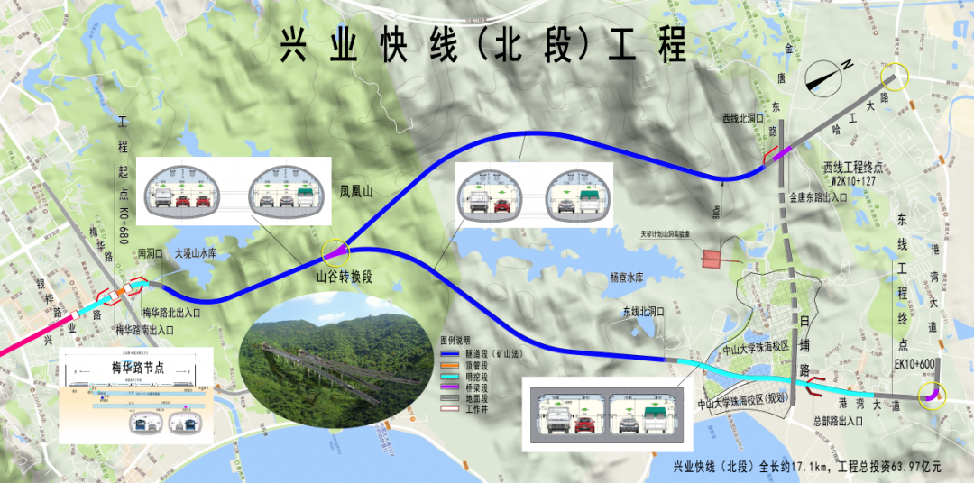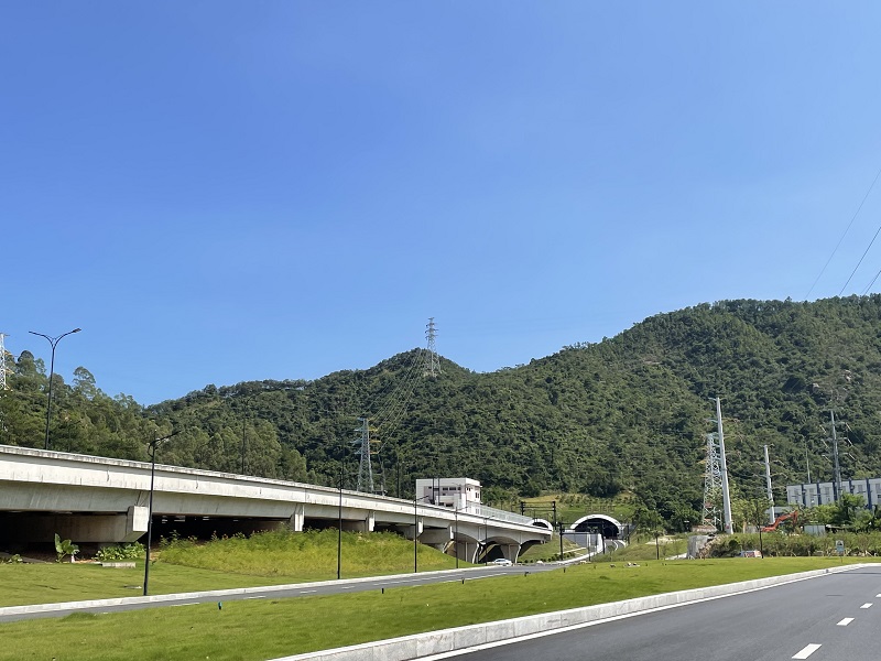 值得一提的是,北段工程全长17.1公里,穿山隧道共有6条,单向长度最长12.3公里。项目整体呈“Y”型,南起梅华路,向北穿越凤凰山,通过山谷转换段桥梁分为东、西线。