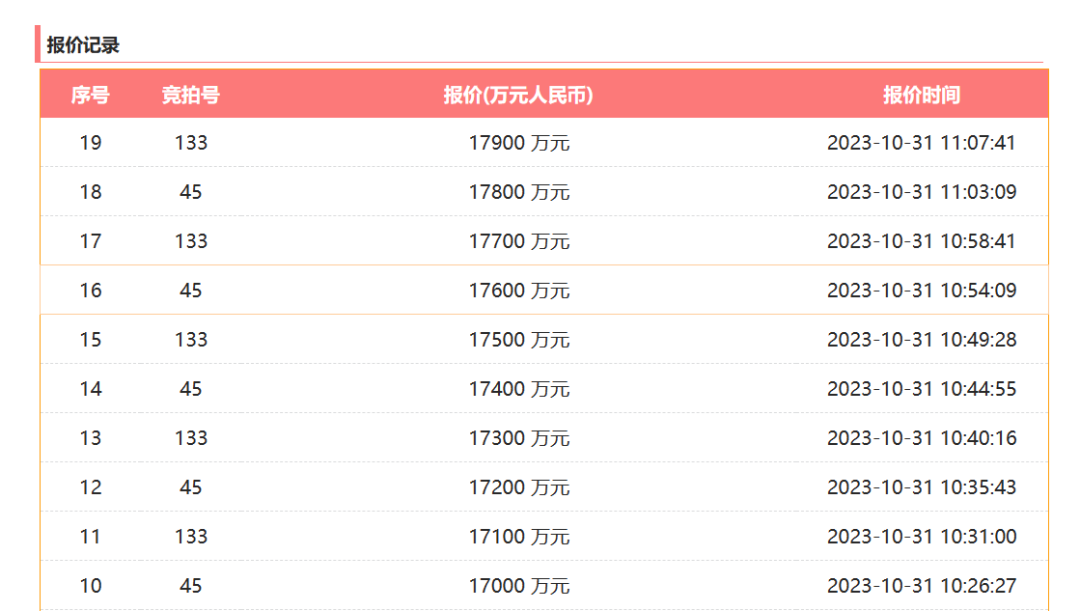 地块于10月31日上午10点正式开拍,竞价过程久违的惊心动魄。直到正式开拍前14分钟,才有房企出价。开拍前5分钟,另一家房企加入竞价。两家房企你来我往,有好几轮都是最后几十秒才加价。