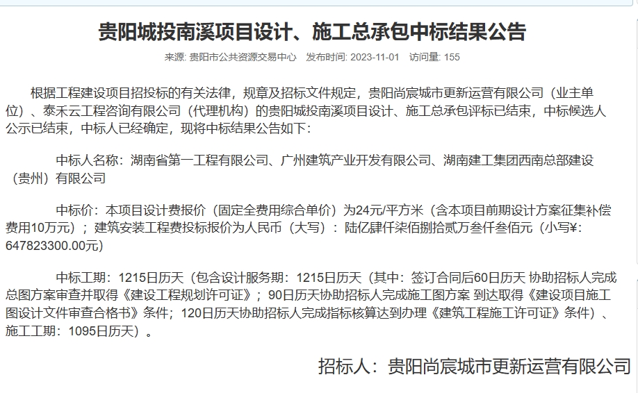 文/乐居新媒体 贵阳 日前,贵州省招标投标公共服务平台发布了贵阳城投南溪项目设计、施工总承包中标结果公告。