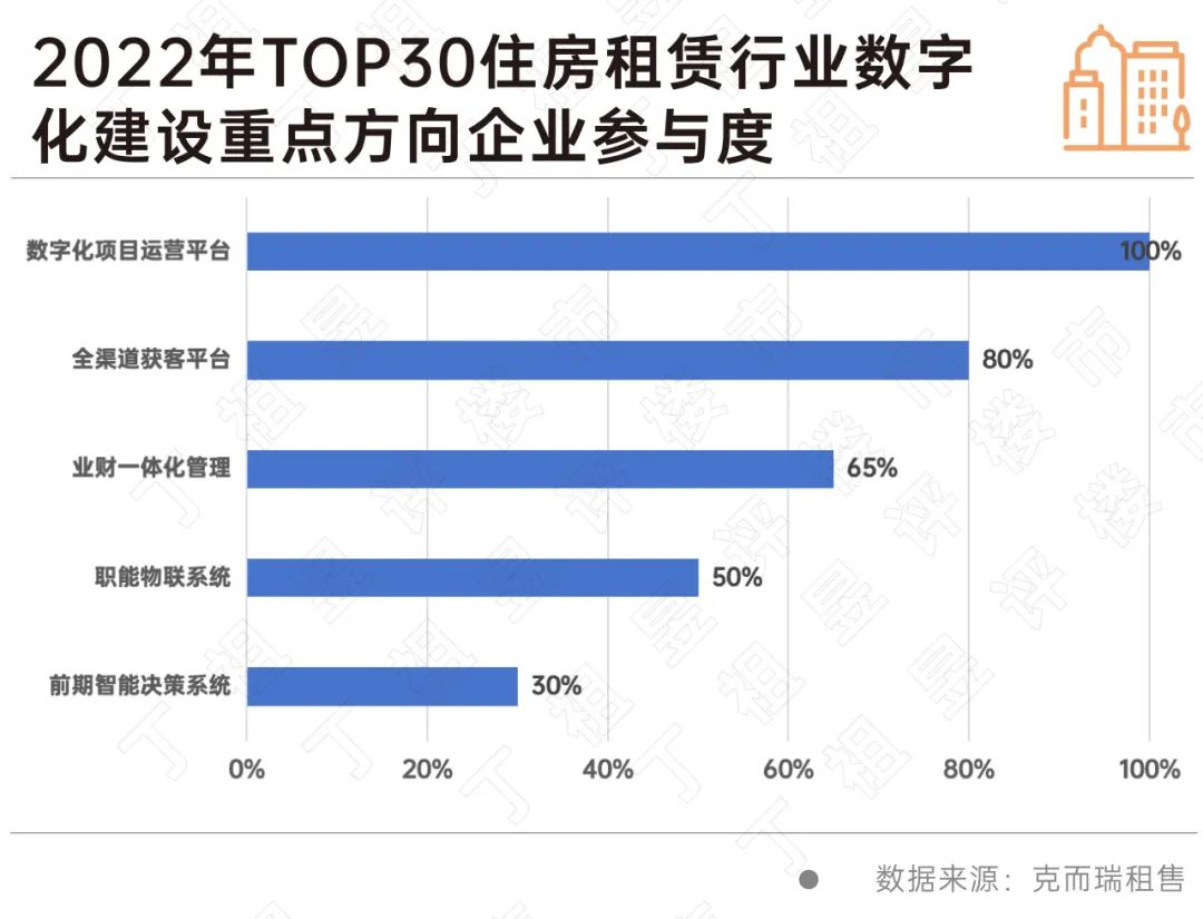 据克而瑞对2022年住房租赁企业数字化建设的调查发现,目前TOP30的头部住房租赁运营商已全部实现自建或第三方搭建数字化项目运营平台。