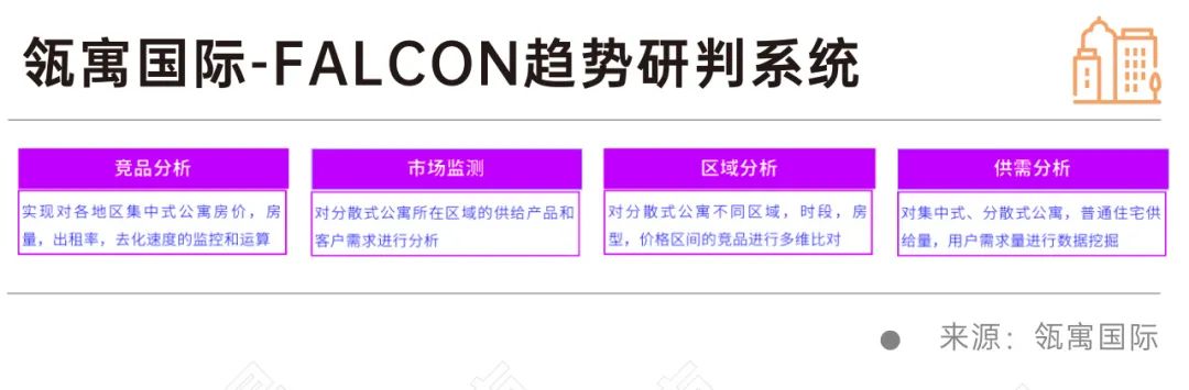 瓴寓国际研发的FALCON趋势研判系统,通过人工智能和大数据能力,建立租赁数据分析模型,系统包括了竞品分析、市场监控、区域分析、供需分析等模块,针对重点城市进行租房数据采集,并以可视化的方式进行数据分析和决策建议。