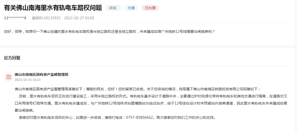 近日,有网友在政务平台上就“有关佛山南海里水有轨电车路权问题”进行了提问:在建的里水有轨电车路权是半独立路权还是全独立路权,未来建成后跟广州地铁12号线需要出闸换乘吗?