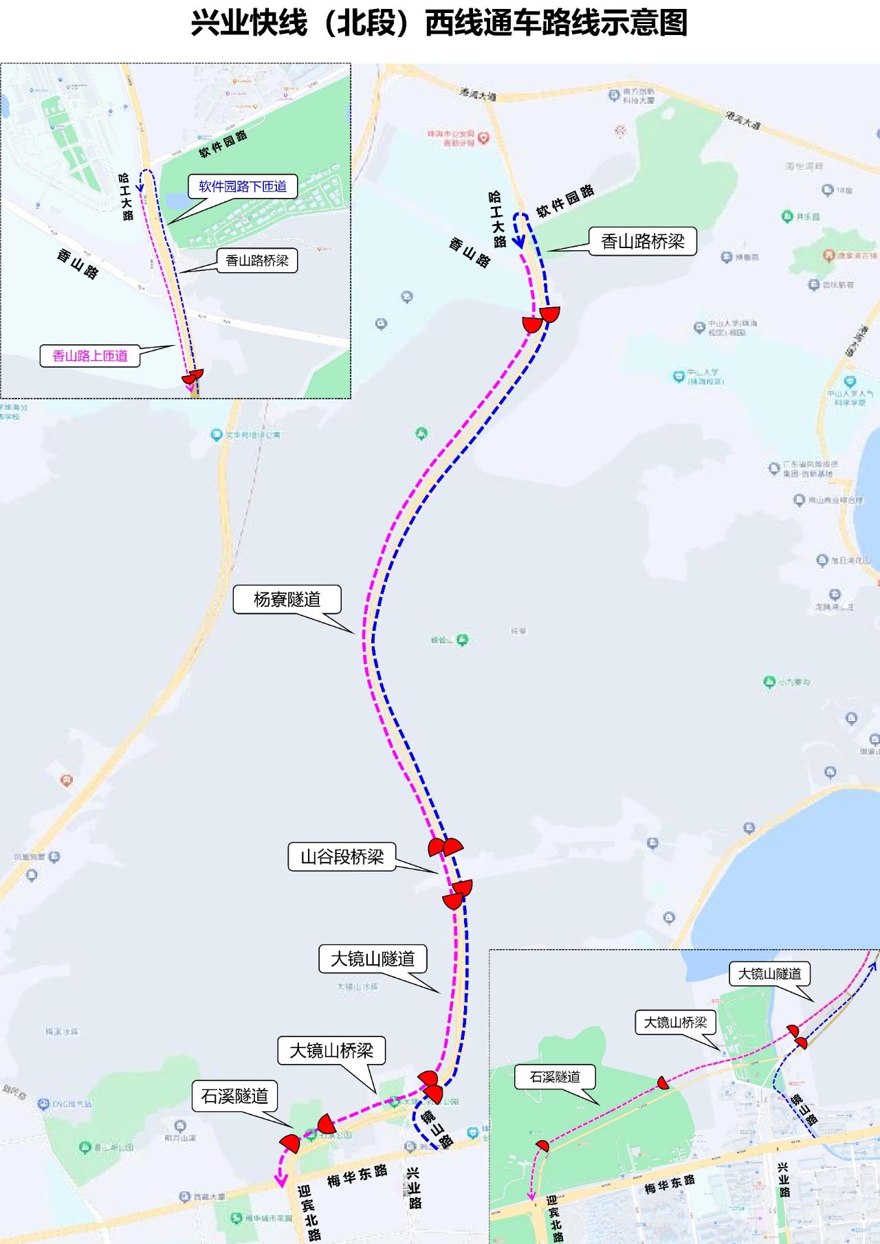 兴业快线(北段)西线及迎宾路支线,在香洲区设置1处出入口(迎宾路出入口),衔接梅华路-迎宾北路交叉口,可通过该路口实现进出兴业快线。同时,开通梅华路-镜山路进入兴业快线的入口,可通过镜山路驶入大镜山隧道。