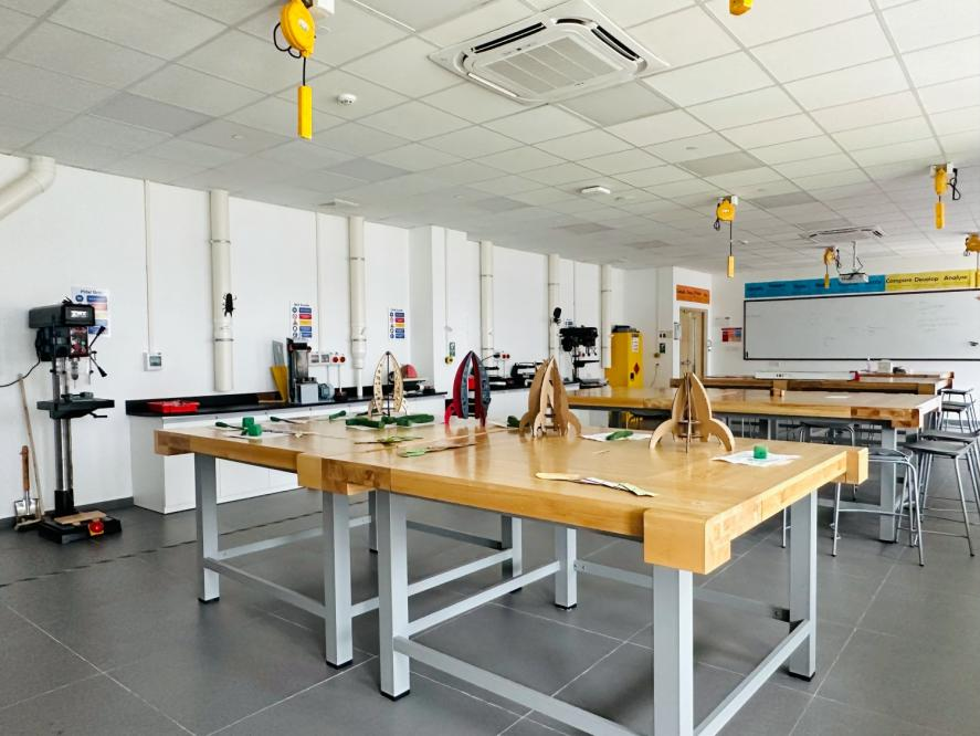 除了学术,佛山霍利斯在艺术、音乐、科学方面也花了不少心思,学校内设置了独立钢琴、萨克斯、打鼓等均有独立小课室,学生可以在休息时间选择喜欢的乐器练习;而在科学室,有着系列工业设计工具,学生们可以自己动手,通过探究式的学习方式,爱上科学爱上创作。