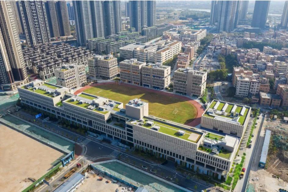 作为广东省重点项目——投资6个亿的国际学校,有着一望无际的国际标准田径运动场,充满西方几何线条美的景观绿植、多元立体色块构建的教学楼和宿舍楼……目之所及,国际感满满。